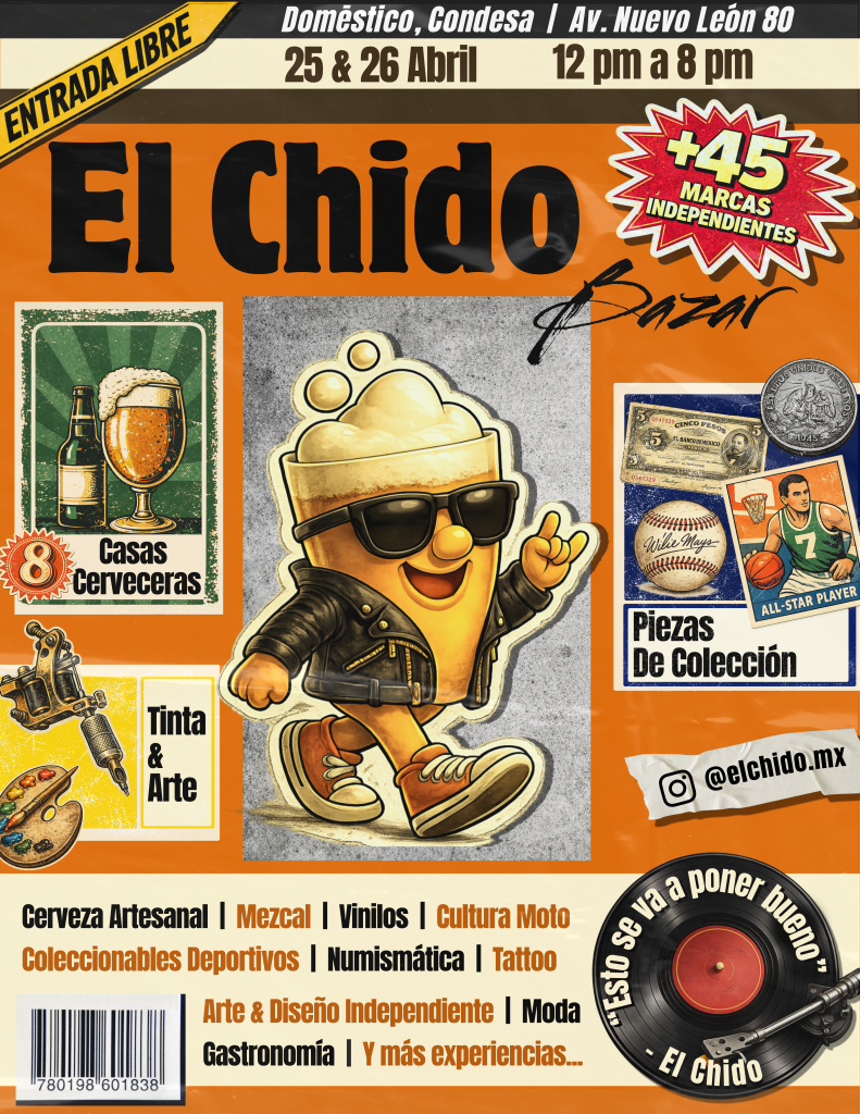 Ciudad de México 22 de abril, 2026- Este 25 y 26 de abril se llevará a cabo la primera edición de El Chido Mx Bazar, un espacio que celebra la creatividad y calidad de la cerveza artesanal mexicana, la gastronomía, el arte y el coleccionismo, todo esto en la principal zona comercial de la Condesa.